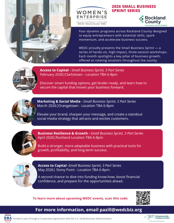 The Rockland County Department of Economic Development & Tourism has partnered with the Women’s Enterprise Development Center (WEDC) to offer Small Business Sprints, which will be a series of hands-on, high-impact, three-session workshops. Each month spotlights a key pillar of business growth, offered at rotating locations throughout the county. These sessions are being offered free of charge.