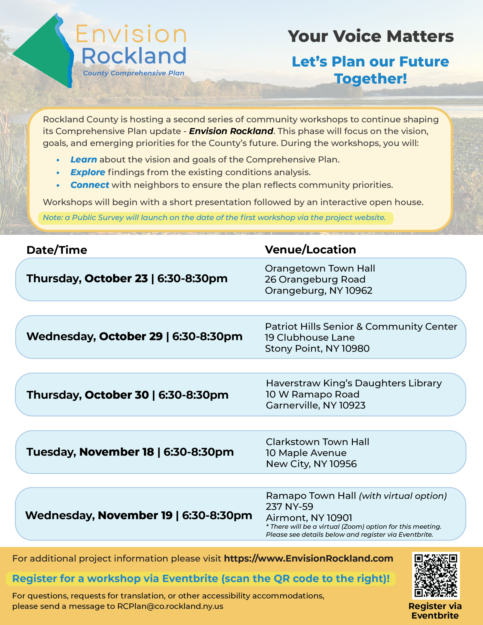 Orangetown Town Hall 26 Orangeburg Road, Orangeburg, United StatesRockland County will host five public meetings to gather input for Envision Rockland—an update to the County’s Comprehensive Plan that will guide the County’s future growth and development. Community Meeting Dates & Locations: Thursday, October 23, in Orangetown Wednesday, October 29, in Stony Point Thursday, October 30, in Haverstraw Tuesday, November 18, in Clarkstown Wednesday, […]