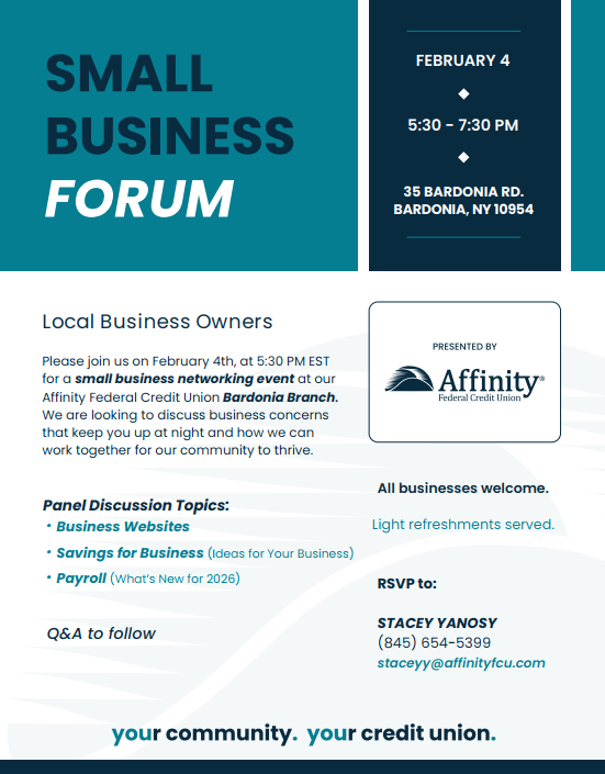 Please join Affinity Federal Credit Union at their Bardonia branch for a small business networking event on February 4, 2026, at 5:30PM to 7:30PM. "We are looking to discuss business concerns that keep you up at night and how we can work together for our community to thrive." Panel Discussion Topics: Business Websites Savings for […]