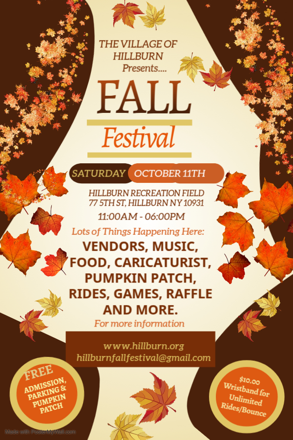 Don’t miss the Hillburn Fall Festival on Saturday, Oct. 11, 2025. 11AM-6PM. Celebrate Fall with music, vendors, food, pumpkin patch, caricaturist, rides, games, and MORE! Fun for the whole family! FREE admission and parking. $10 wristband for unlimited rides/bounce activities. Enjoy family, fun and community spirit! CLICK HERE for more details.