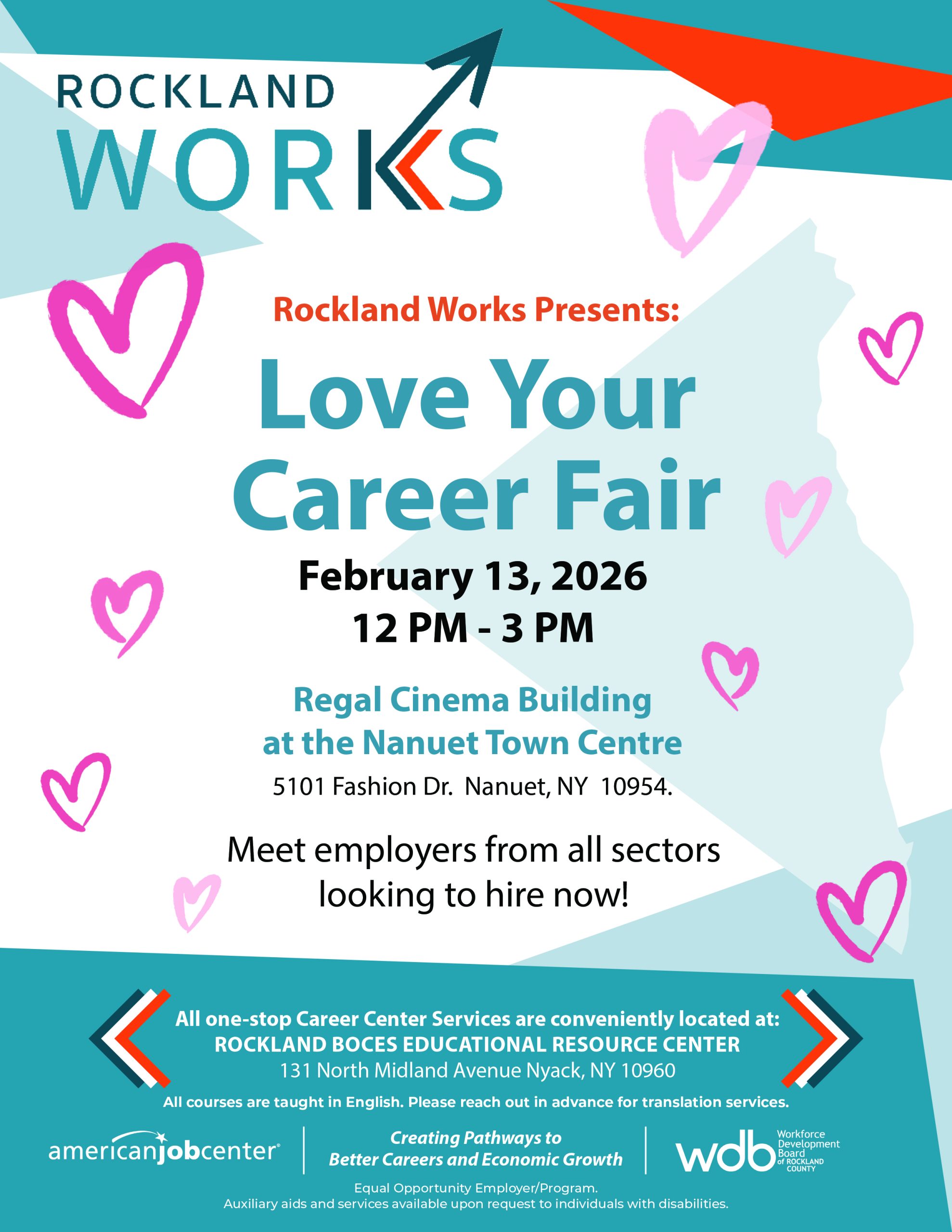 Join Nanuet Town Centre & Rockland Works Feb 13 for the Love Your Career Fair! Connect with 30+ employers hiring across diverse industries.