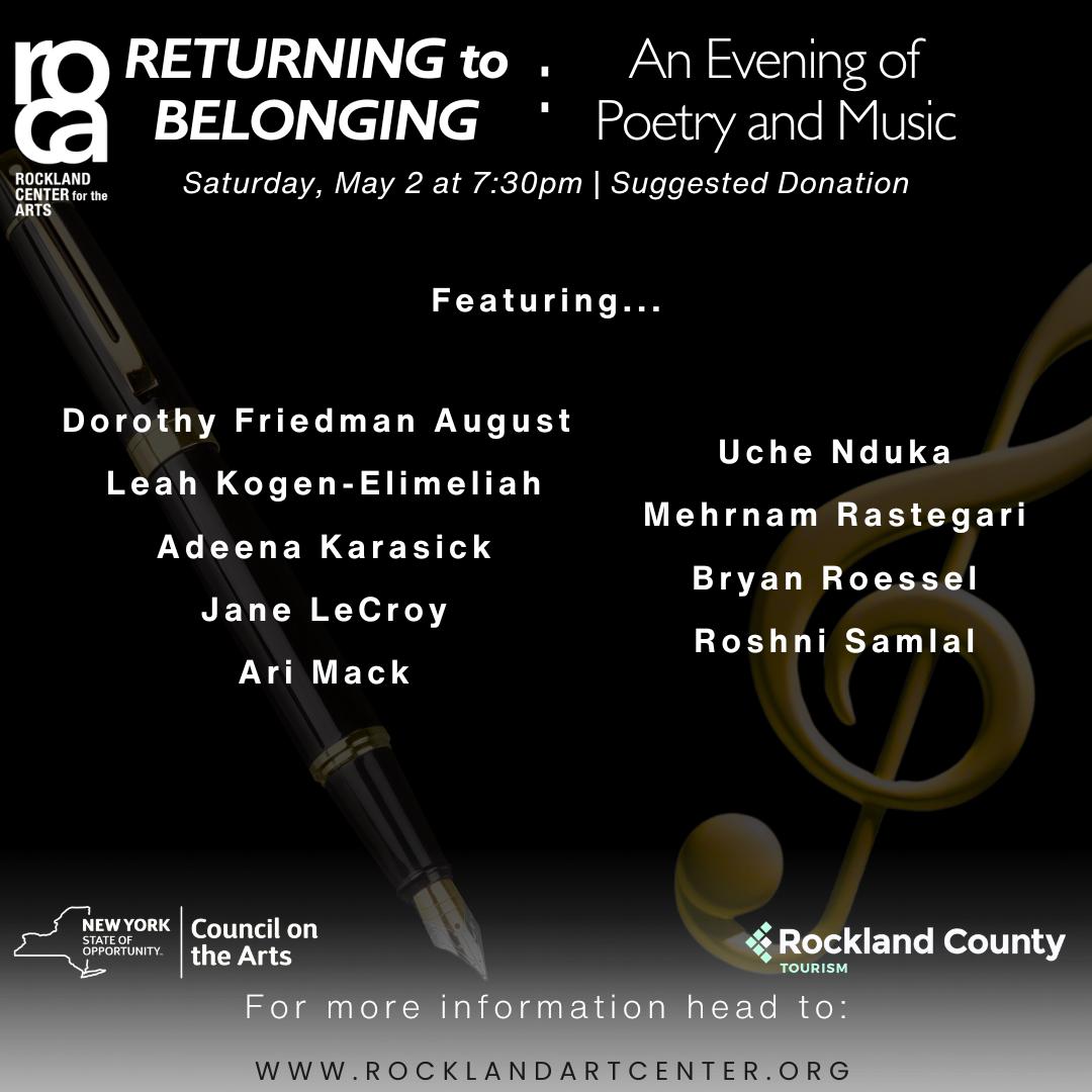 Rockland Center for the Arts (RoCA) presents RETURNING to BELONGING: An Evening of Poetry & Music. Saturday, May 2, 2026. 7:30PM. Join RoCA for a powerful night of poetry and music. Led by incredible and significantly talented local poets and musicians, “Returning to Belonging” fuses the art of poetry with music to create an international combination of different cultures and perspectives. CLICK HERE for more information.