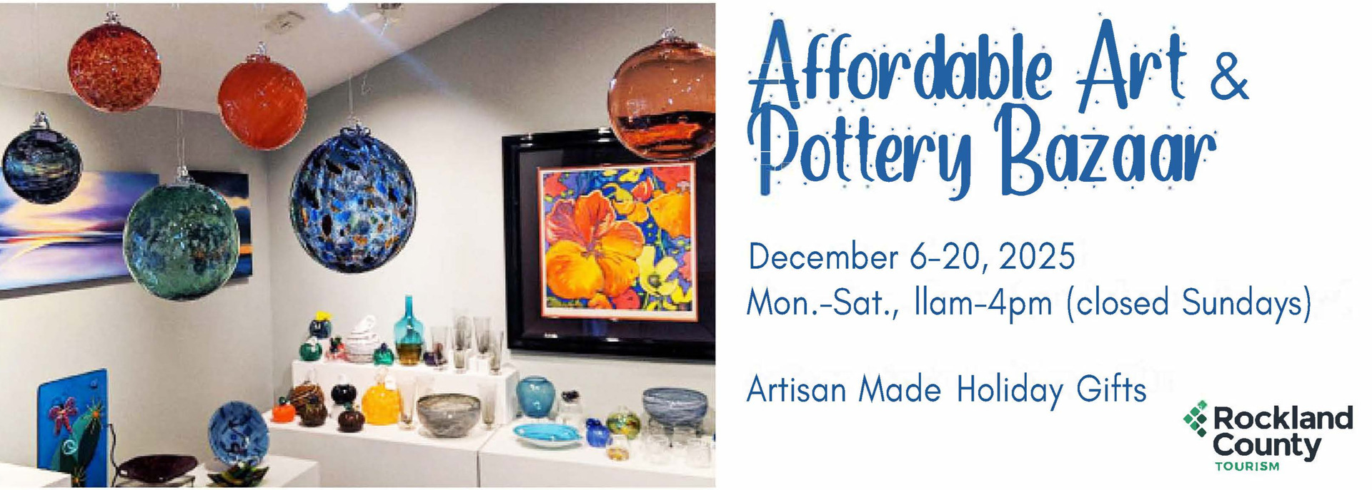 Rockland Center for the Arts’ Affordable Art & Pottery Bazaar returns!  December 6-20, 2025. Monday-Saturday. 11AM-4PM.  Discover handmade art, pottery and gifts made by local artists.  Just in time for the holidays!  FREE entry.  CLICK HERE for details.
