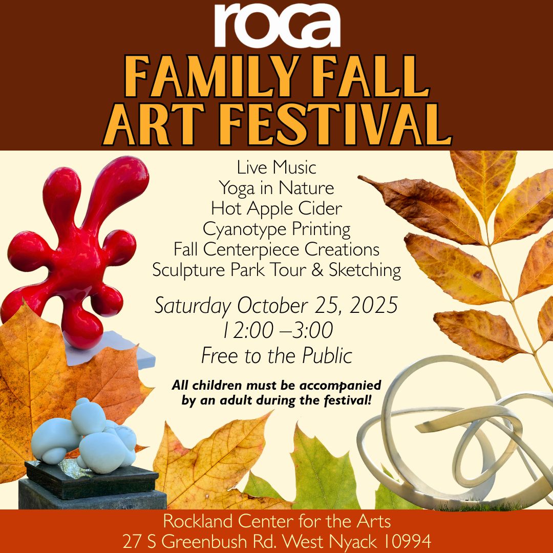 Don’t miss the Rockland Center for the Arts Family Fall Art Festival! Saturday, Oct. 25. 12PM-3PM. Enjoy live music, family art workshops, sculpture tours and MORE! Free event! Fun for the whole family! (Rain Date: Oct. 26). CLICK HERE for details.