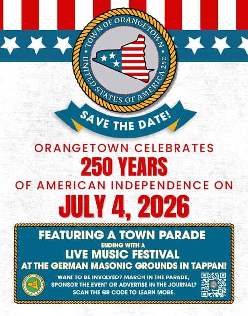 Join us for the Town of Orangetown Rev 250 Celebration. Saturday, July 4, 2026 from 12PM-6PM at the German Masonic Park in Tappan. Parade kick-off in Tappan: 10:00AM.