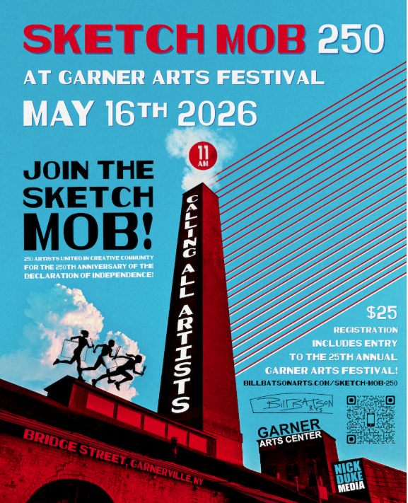 Join Sketch MOB 250 at the GARNER Arts Festival. Saturday, May 16. 11AM. Don’t miss this exciting opportunity to join a sketch mob of 250 artists of all ages and skill levels to create a crowd-sourced landscape of the GARNER Historic District in celebration of GARNER Arts Festival’s 25th anniversary and the 250th Anniversary of the Declaration of Independence. Presented by GARNER Art Center in partnership with Bill Batson Arts. CLICK HERE for more information.