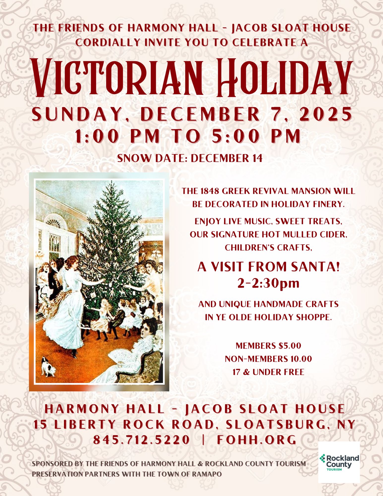 Don’t miss the Annual Victorian Holiday. Sunday, Dec. 7, 2025. 1PM-5PM. Join the Friends of Harmony Hall-Jacob Sloat House inthe historic 1848 Greek Revival mansion which will be decorated in holiday finery. Enjoy live music, sweet treats, hot mulled cider, Children’s crafts, unique hand-made crafts in Ye Olde HOLIDAY Shoppe, and of course, a visit from Santa 2-2:30pm! Tickets on sale! CLICK HERE for more information.