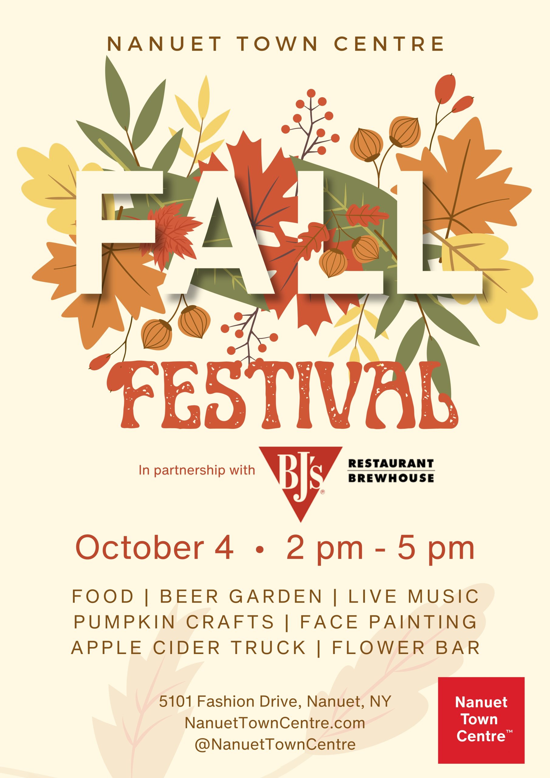 The Nanuet Town Centre 5101 Fashion Drive, Nanuet, NYJoin us for the Fall Festival at BJ's Restaurant at the Nanuet Town Centre. Saturday, Oct. 4, 2025. 2PM-5PM. Celebrate Fall with live music, pumpkin crafts, a flower bar, photo ops, cider treats, performers, Beer garden and MORE! FREE event! Fun for the whole family! CLICK HERE for more information.